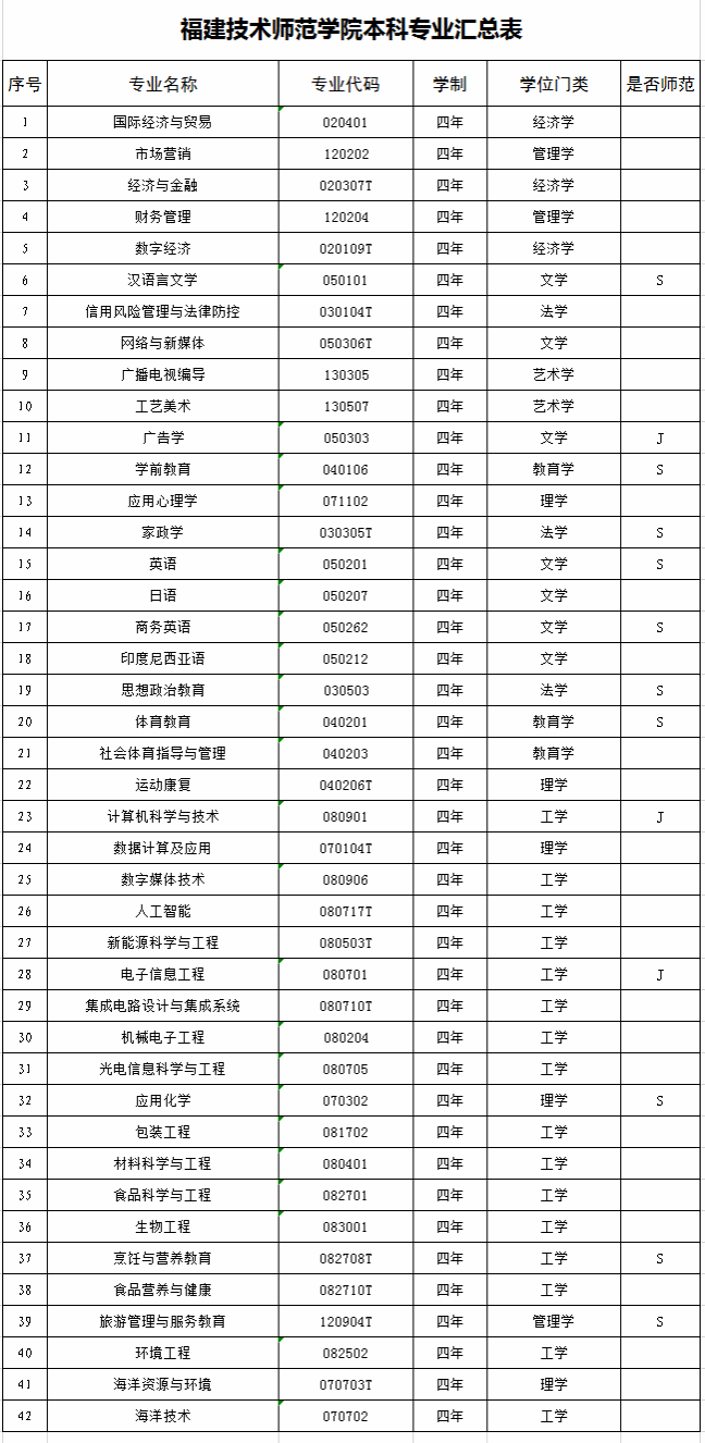 福建技术师范学院本科专业汇总表