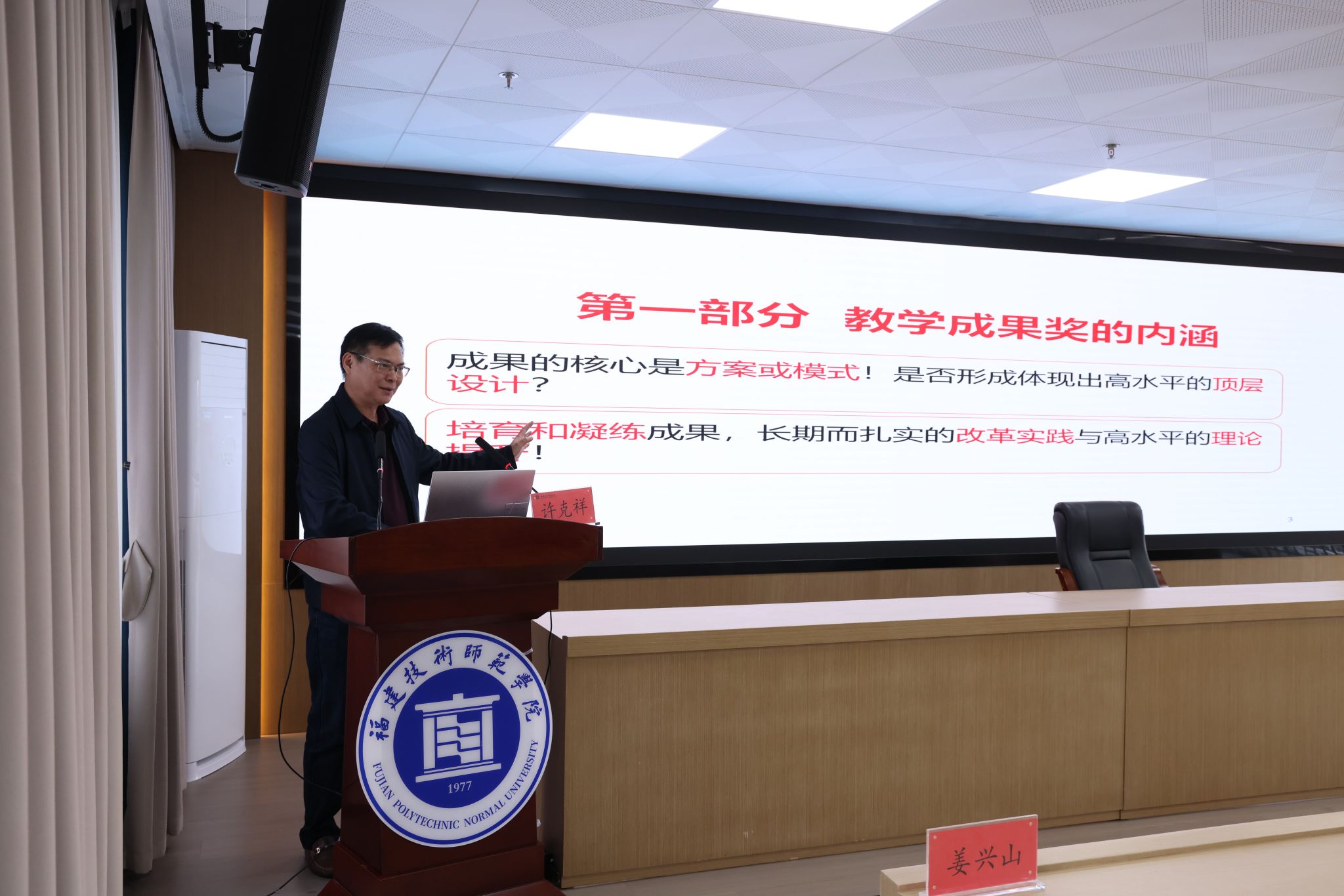 随后,会议进入专题辅导环节。福建中医药大学教师教学发展中心主任、教育管理研究员、硕士生导师许克祥教授应邀作题为《教学成果的构思与凝练》的专题讲座。许教授从教学成果奖的内涵解读、选题策略、撰写技巧、成果总结与支撑材料准备等四个方面,结合丰富案例,系统分享了申报经验与实践要领。讲座结束后,许克祥教授还针对我校教师提交的申报材料,逐一开展面对面点评指导,并提出具体修改建议。