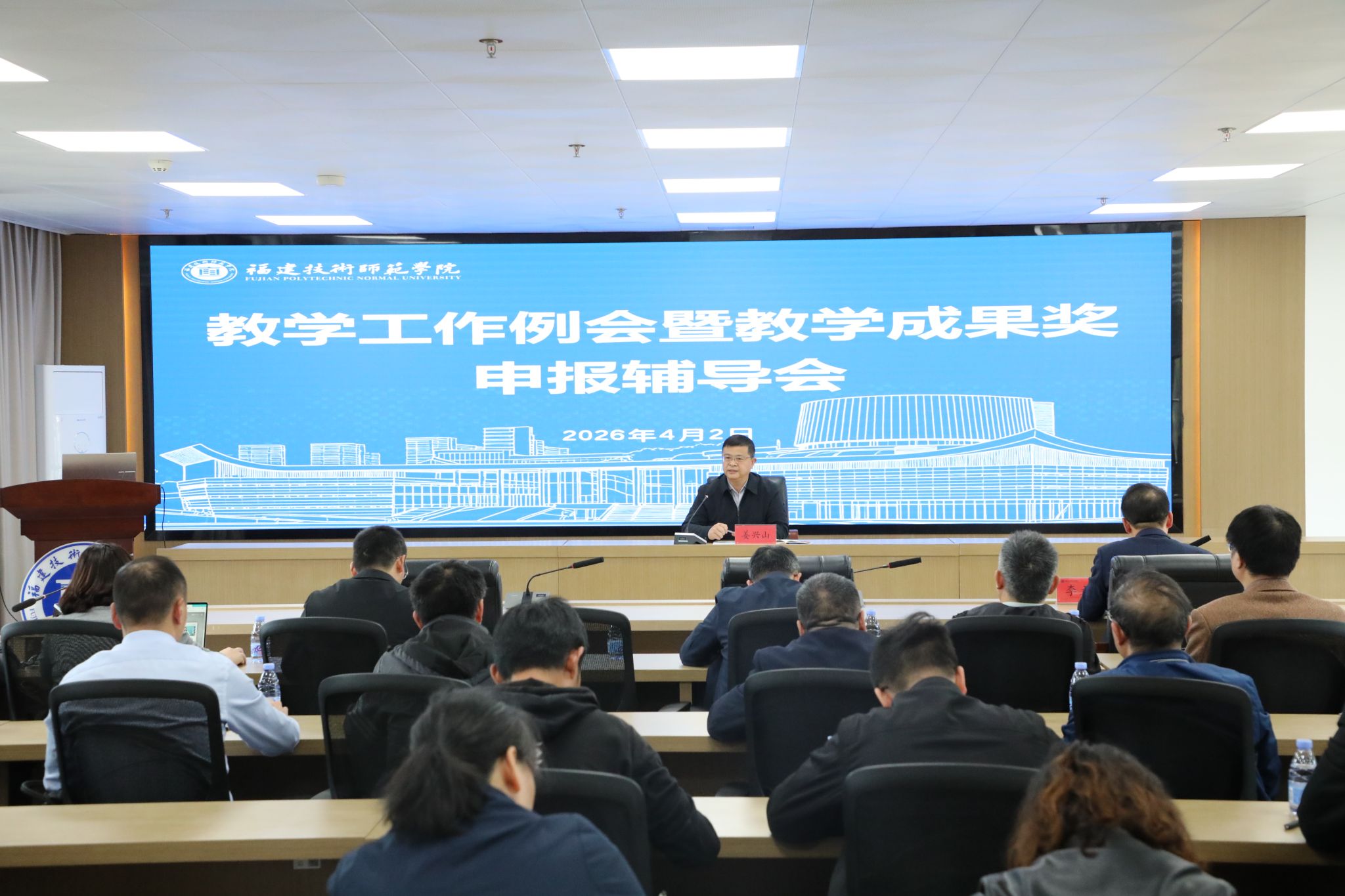 会议于4月2日下午在林联兴楼12层集贤厅召开。副校长姜兴山出席会议并讲话,教务处负责人、各二级学院分管教学工作的负责人、教学科研办公室负责人及本年度校级教学成果奖全体申报人参加了会议。