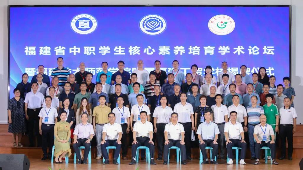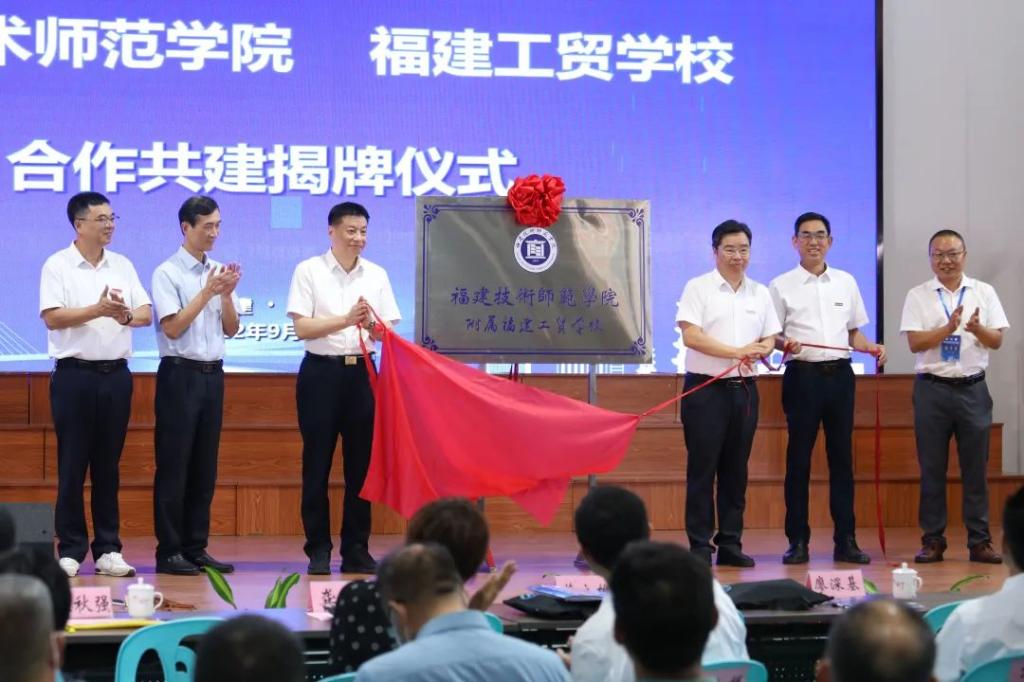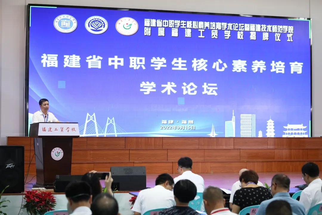 9月15日,福建省中职学生核心素养培育学术论坛暨福建技术师范学院附属福建工贸学校签约揭牌仪式在福建工贸学校举行。福建省发展和改革委员会党组成员、一级巡视员,福建省粮食和物资储备局党组书记、局长孙建平,福建技术师范学院校长廖深基,福建省粮食和物资储备局党组成员、副局长蔡立雄,福建技术师范学院副校长商光美,福建省职业技术教育中心主任龚森,福建省粮食和物资储备局机关党委专职副书记(人事处处长)、一级调研员王思丽,福建师大全国重点建设职教师资培养培训基地主任连文毓,福建工贸学校党委书记、校长张秋强等出席仪式,并共同为附属校揭牌。会议通过线上线下相结合的方式进行,省内外职业教育研究专家代表、省职业教育教师发展联盟会员单位代表、企业代表参加了有关活动。