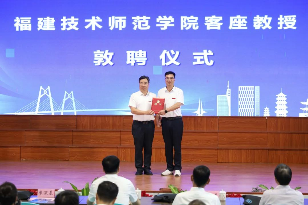 福建技术师范学院廖深基校长向福建工贸学校张秋强校长颁发客座教授聘书。