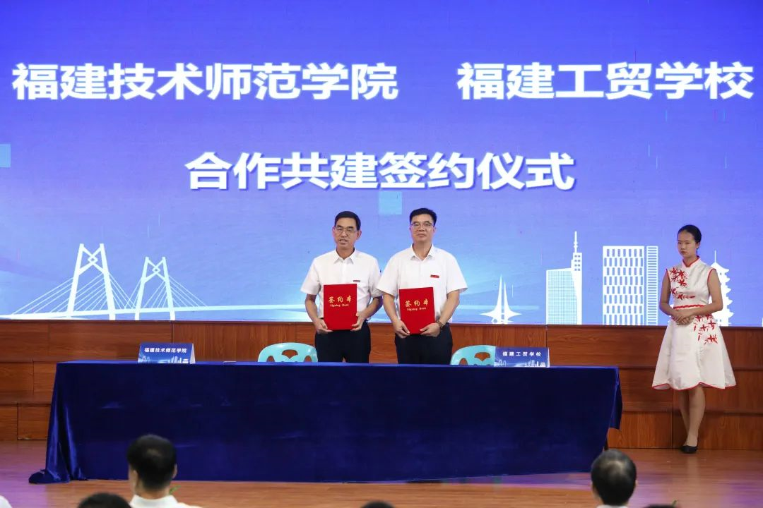 福建技术师范学院副校长商光美与福建工贸学校校长张秋强分别代表双方,签订合作共建协议。