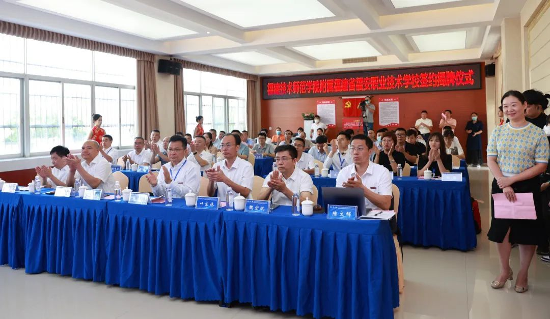 福建技术师范学院党委副书记林海峰与福建省福安职业技术学校党总支部、学校负责人李成文分别代表双方,签订合作共建协议。