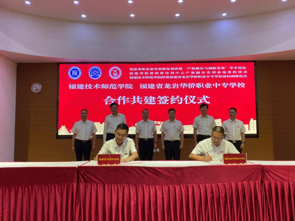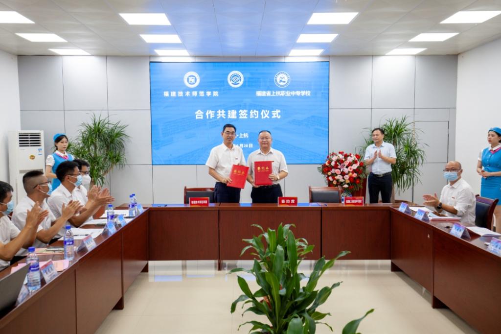 福建技术师范学院副校长商光美与福建省龙岩华侨职业中专学校校长赖永贵分别代表双方,签订合作共建协议。