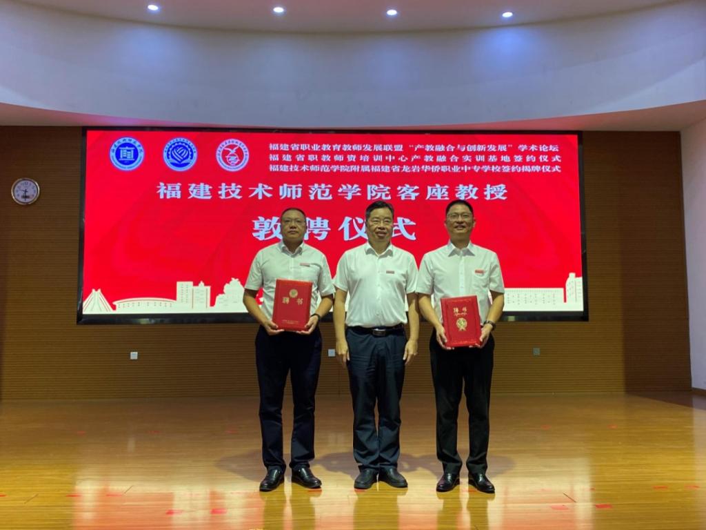福建技术师范学院廖深基校长向附属福建省龙岩华侨职业中专学校党委书记马锦、校长赖永贵颁发客座教授聘书。