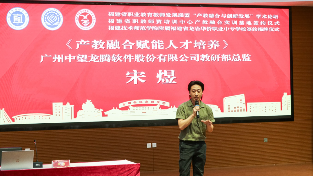 签约揭牌仪式后,福建省职业教育教师发展联盟“产教融合与创新发展”学术论坛开讲,广东省机械技师学院党委书记、二级教授冯为远,闽西职业技术学院教授、教务处长张源峰,广州中望龙腾软件股份有限公司教研部总监、校企合作领域资深专家宋煜等三位专家学者,分别作《世界技能大赛冠军是如何炼成的》《双高校建设背景下产教融合实施路径的思考》《产教融合赋能人才培养》等专题报告。
