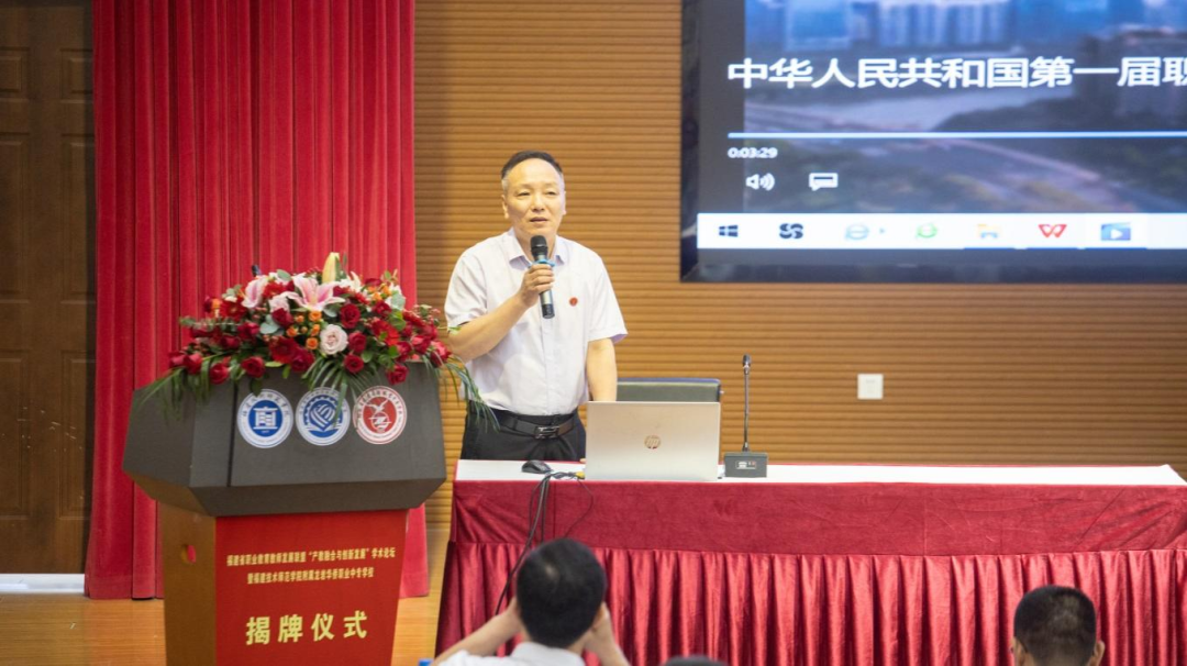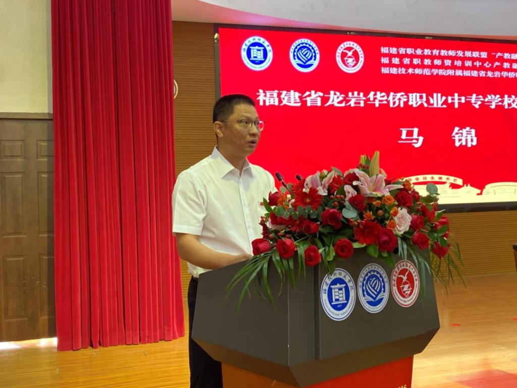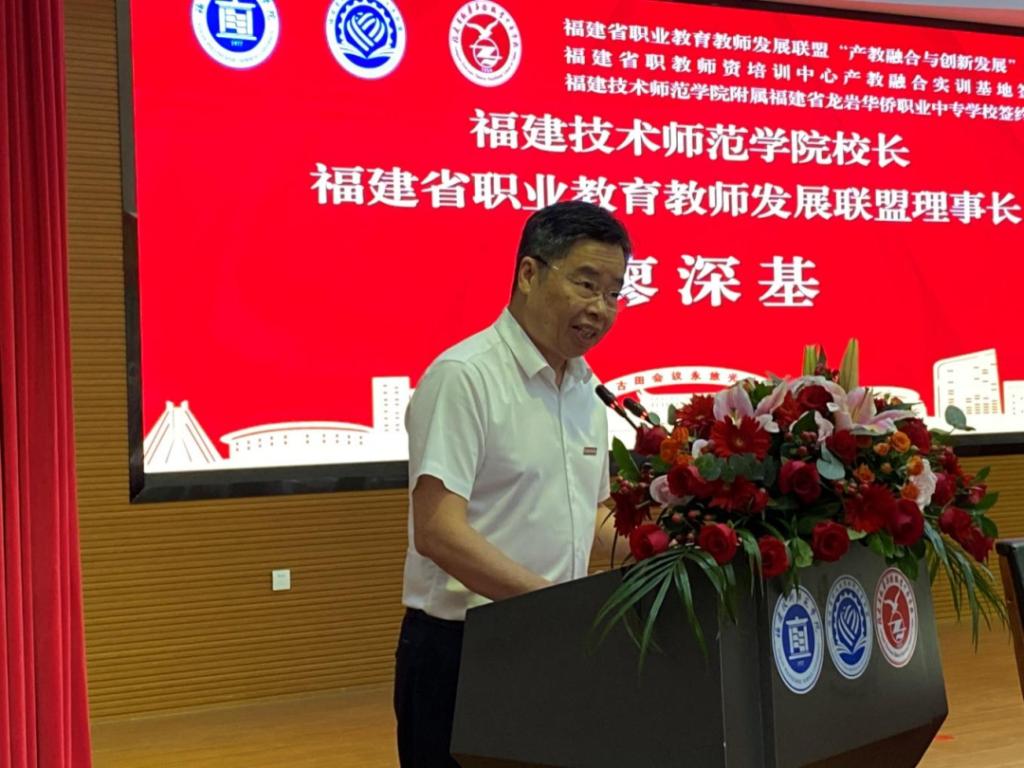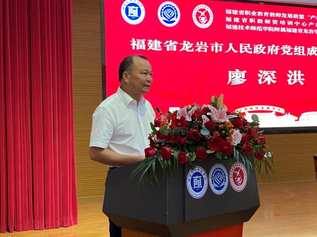 福建技术师范学院校长、福建省职业教育教师发展联盟理事长廖深基作了题为《打造职业教育发展共同体,服务老区苏区振兴发展》的主旨讲话。他表示,福建技术师范学院是应服务职业教育发展、补齐构建高质量教育体系短板而生的省属公办本科高校,在职业教育加快转变发展方式的新阶段,学校积极重构职业教育发展生态,打造开放融合、多元参与、共建共享的职业教育发展体系,着力形成人才共育、师资共培、基地共建、科研共促、资源共享、事业共推的发展共同体,持续提高职业教育发展质量与发展能级,推动人才培养扩容提质,不断增强职业教育适应性,把职业教育的大有可为转化为大有作为。他指出,龙岩华侨职业中专学校是一所根植于红色土地,办学实力强、办学质量高的职教名校。将龙岩华侨职业中专学校纳入福建技术师范学院附属校,与行业龙头企业签订产教融合合作协议,是我们落实习近平总书记关于老区苏区工作重要指示要求以及习近平总书记来闽考察重要讲话精神,深入推进职业教育育人方式、办学模式改革,倾力支持老区苏区高质量振兴发展的生动实践和重要举措。他强调,学校将充分发挥学科、人才、平台等资源优势,助力附属龙岩华侨职业中专学校建设成为一所红色基因突出、类型特色鲜明、办学质量领先的品牌强校,希望附属龙岩华侨职业中专学校弘扬苏区精神,传承红色基因,与福建技术师范学院一道,在推动福建职业教育改革发展上作新贡献,在全方位推进闽西革命老区高质量发展示范区建设中展现新作为。