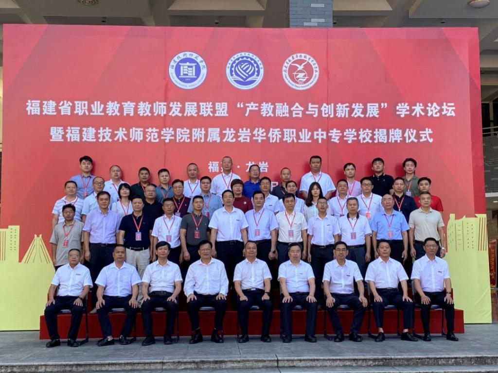 9月28日上午,福建省职业教育教师发展联盟“产教融合与创新发展”学术论坛暨福建技术师范学院附属福建省龙岩华侨职业中专学校揭牌仪式在福建省龙岩华侨职业中专学校举行。福建省龙岩市人民政府党组成员、副市长廖深洪,福建技术师范学院校长、福建省职业教育教师发展联盟理事长廖深基,福建技术师范学院副校长商光美,新罗区人民政府副区长林峰,新罗区教育局党组书记、局长陈金堂,龙岩华侨职业中专学校党委书记马锦等出席签约揭牌仪式,并共同为附属校揭牌。会议通过线上线下相结合的方式进行,广东省机械技师学院党委书记冯为远,省内外职业教育研究专家代表、省职业教育教师发展联盟会员单位代表、企业代表参加相关活动。龙岩市教育局党组成员、副局长温寿春主持揭牌仪式。