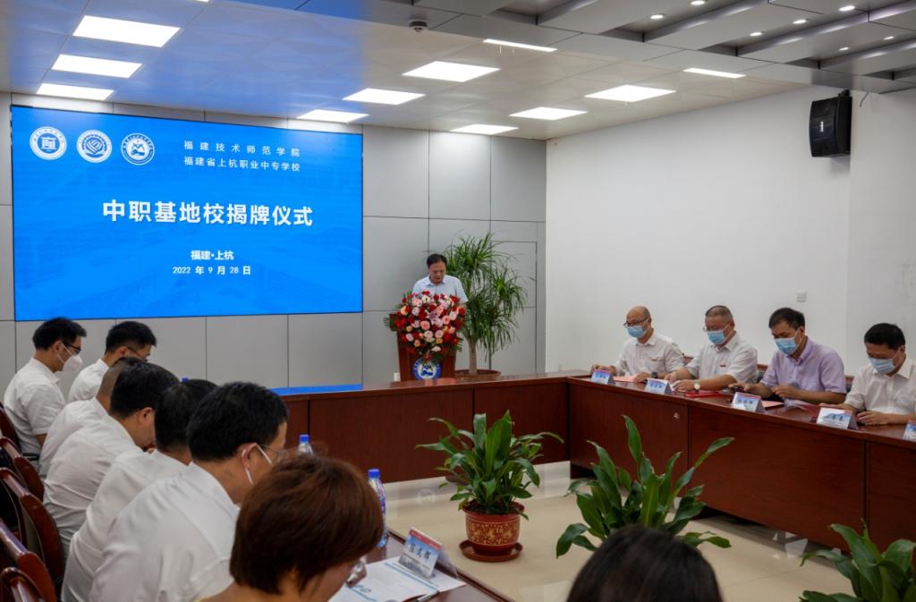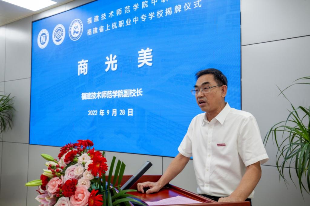 福建技术师范学院副校长商光美代表福建技术师范学院致辞,他表示,作为福建省唯一一所定位培养职业教育师资的省属本科院校,本着“优势互补、资源共享、互惠双赢、共同发展”的原则建设基地校,充分发挥基地校区域影响与学科示范引领作用,推动两校合作共建,打造发展共同体,在教师素质提高、教学能力提升、学科专业建设、教师德育能力提升、实习实训基地提供等方面实现合作共赢。