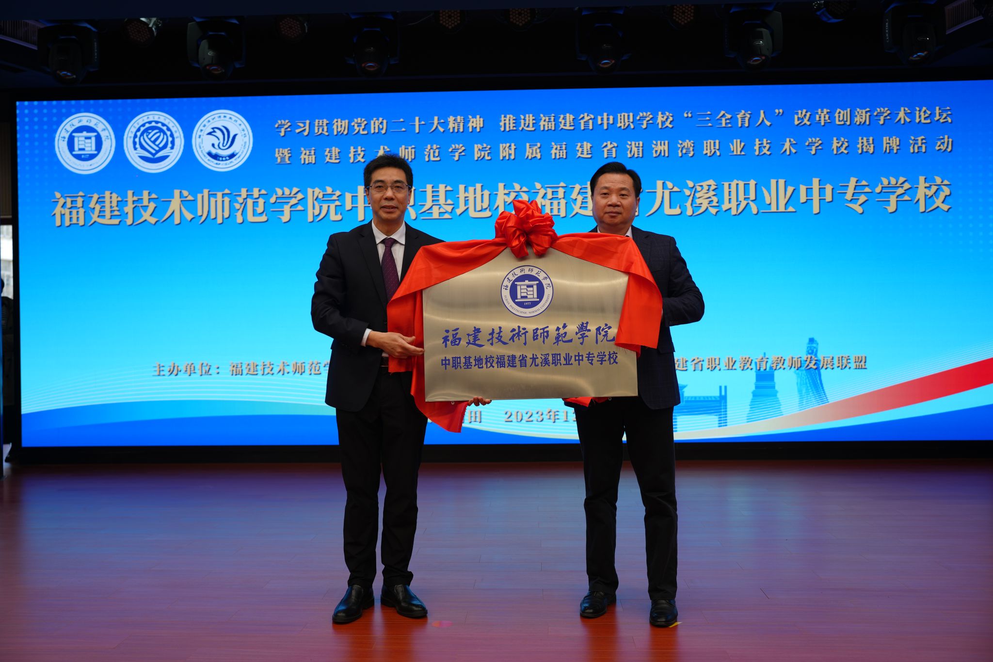12月29日,学习贯彻党的二十大精神、推进福建省中职学校“三全育人”改革创新学术论坛暨福建技术师范学院附属福建省湄洲湾职业技术学校揭牌仪式、福建技术师范学院中职基地校授牌仪式系列活动在福建省湄洲湾职业技术学校举行。福建技术师范学院党委副书记、校长吴克寿,莆田市人民政府党组成员、副市长胡国防,莆田市委教育工委书记、教育局党组书记、局长彭鲤芳,湄洲湾职业技术学院党委副书记、院长许冬红,莆田市教育局党组成员、副局长薛强,福建省湄洲湾职业技术学校副校长(主持工作)陈玉彪等出席本次签约揭牌仪式,并共同为福建技术师范学院附属福建省湄洲湾职业技术学校揭牌。活动通过线上线下相结合的方式进行。省内外职业教育研究专家代表、福建省职业教育教师发展联盟会员单位代表、福建技术师范学院附属校基地校代表、职业院校代表、企业嘉宾等参加了有关活动。