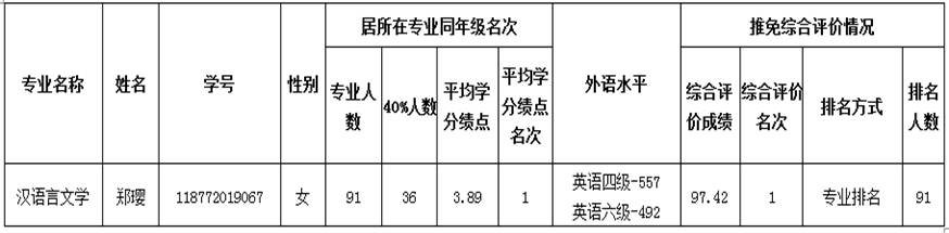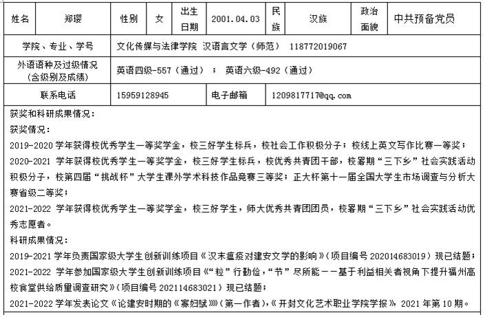 根据《福建师范大学推荐优秀应届本科毕业生免试攻读研究生工作实施办法》(师大党政办〔2022〕7号)文件精神,由符合条件的同学申请,经学院推荐,校推免生遴选工作领导小组讨论决定,拟将文化传媒与法律学院19级汉语言文学专业郑璎同学作为免试推荐候选人报福建师范大学教务处。现将郑璎同学的基本情况予以公示,公示期限至2022年9月21日17:00。在此期间,个人、集体、组织如对公示对象的资格有意见,可通过来信、来访、来电的形式向教务处反映。