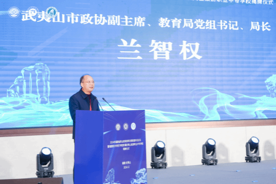 武夷山市政协副主席、教育局党组书记、局长 兰智权对两校合作表示热烈祝贺。他指出,职业教育是国民教育体系和人力资源开发的重要组成部分,肩负着培养多样化人才、传承技术技能、促进就业创业的重要使命。他表示,福建省职业教育教师发展联盟为全省职业教育教师搭建了一个交流合作、协同创新、共同发展的重要平台。必将为推动福建省职业教育教师队伍建设提供宝贵经验和有益借鉴。武夷山市将以本次签约揭牌为起点,充分借助福建技术师范学院的办学实力和资源优势,多措并举做好职业教育各项工作,加快构建高质量发展的现代职业教育体系。他寄语武夷山旅游职业中专学校以此为契机,倍加珍惜难得的发展机遇,积极探索创新合作办学模式,努力打造成为全省乃至全国职业教育的示范校、特色校。为武夷山市培养更多适应茶文旅产业发展需求的高素质职业技能人才,进一步擦亮“武夷山”这张亮丽名片,助力武夷山市打造国际知名旅游目的地。