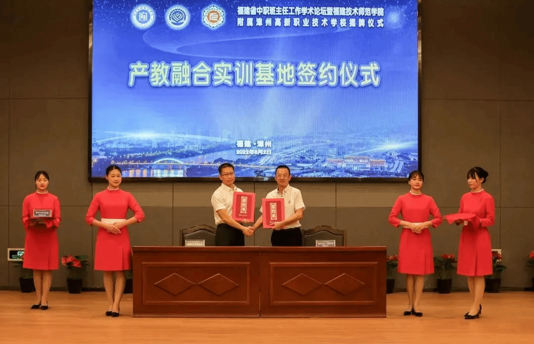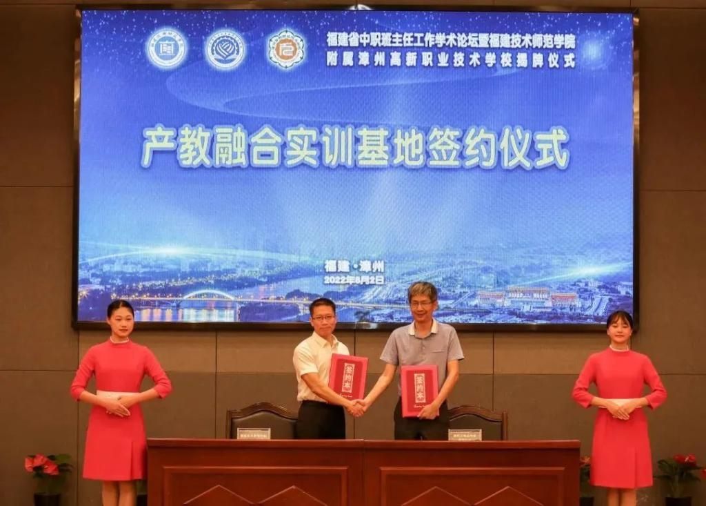 揭牌仪式后,还举行了福建省职教师资培训中心产教融合实训基地签约仪式。福建省职教师资培训中心与福建科能电子科技开发有限公司、漳州万利达科技有限公司签订了产教融合合作协议。