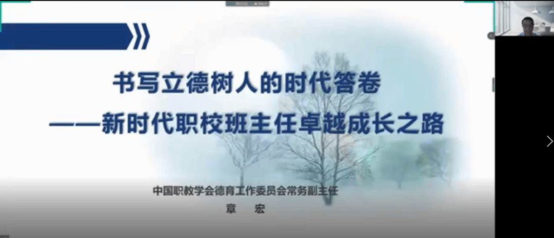 报告2:章宏的《书写立德树人的时代答卷-新时代职校班主任卓越成长之路》提出把握新时代德育工作的背景与使命,遵循德育工作的基本规律,推动学校德育工作实践创新