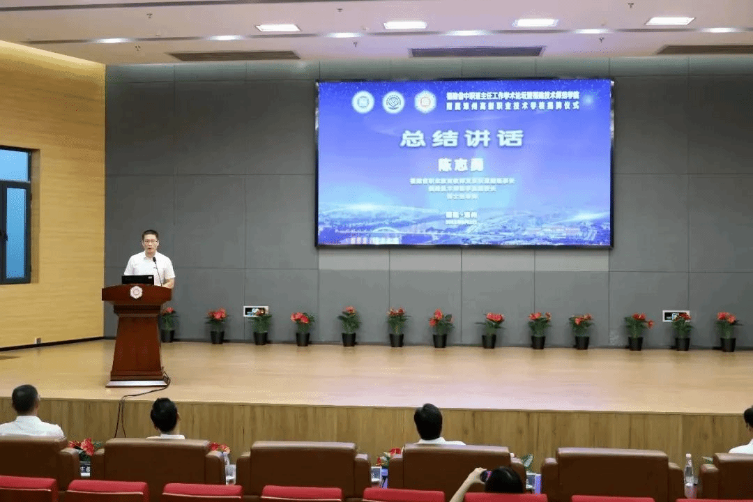 福建省职教师资培训中心主任、福建技术师范学院副校长、博士生导师陈志勇教授作总结讲话。他表示,本次学术论坛是我们贯彻落实新《职业教育法》《教育部办公厅关于加强中等职业学校班主任工作室培育建设工作的通知》等的重要举措。通过专家学者、企业代表和一线中职教育工作者的深入交流研讨,本次论坛对当前班主任工作中的目标定位、工作成效、业绩考核等痛难点进行了破局,提出了推动福建省中职班主任工作再上新台阶的新举措新思路,既有理论的思考又有实践的探索,既有难点痛点的剖析又有方法技巧的提升,是对中职思想政治教育工作和班主任工作的一次全方位多层次、广视野的探讨,具有重要的启发。结合学术论坛成果,陈志勇教授分享了中职班主任工作中关于思政教育、赏识教育、温柔教育等方面的思考与见解,并对福建省职业教育教师发展联盟下一阶段的工作进展和目标作了介绍说明。