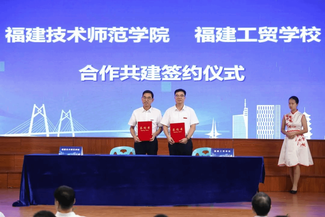 福建技术师范学院副校长商光美与福建工贸学校校长张秋强分别代表双方,签订合作共建协议。