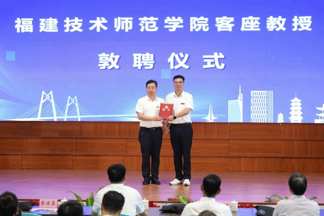 福建技术师范学院廖深基校长向福建工贸学校张秋强校长颁发客座教授聘书。