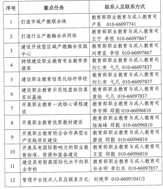 各重点任务建设指南将在现代职业教育体系改革管理公共信 息服务平台(网址:http://zj.chinaafse.cn/, 以下简称管理平台) 予以公布。各地要积极组织有关政府部门、学校、企业、产业园 区承接重点任务,明确各重点任务牵头建设单位(以下简称建设单位),根据各重点任务建设指南的要求,整合教育产业政策资 源、形成建设方案(含年度绩效目标)并上传管理平台,自主开展建设,接受监督调度。各项目咨询联系人及联系方式见附件。